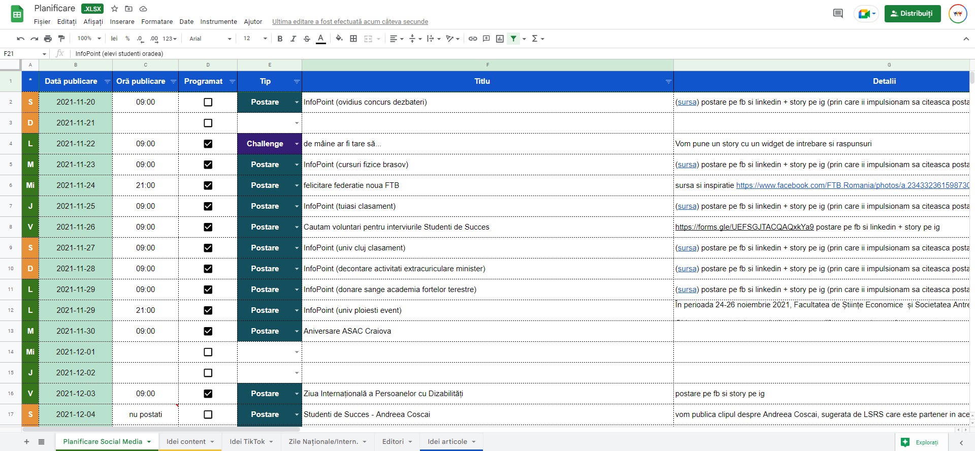 Locul în care sunt planificate articolele și comunicatele făcute de către tine și împreună cu coordonatorul tău conform unei strategii.