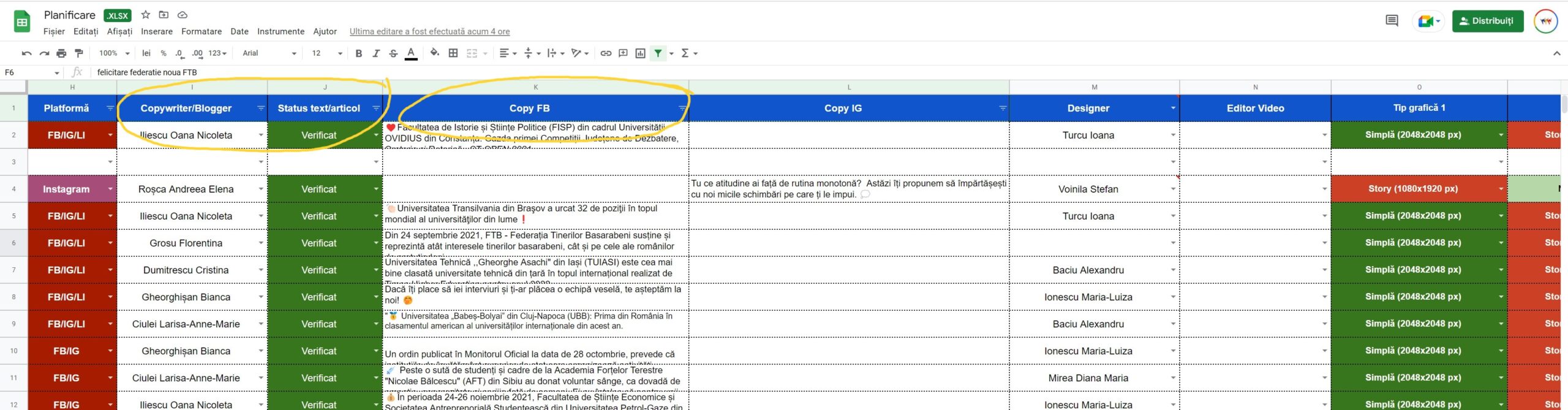 Caută pe Planificare rândul articolului/comunicatului la care trebuie să lucrezi și pe coloana Copywriter/Blogger apasă pe celulă și caută numele tău prin scrierea primelor litere sau derulare. Pasul următoar trebuie să îți setezi în celula următoare, pe coloana Status text/articol statusul articolului tău din acel moment. De preferat este să îți setezi din momentul în care îl preiei și să continui să îl actualizezi constant până la „Terminat”. Statusul de „Verificat” și „Refacere” fiind puse după caz de coordonator.
