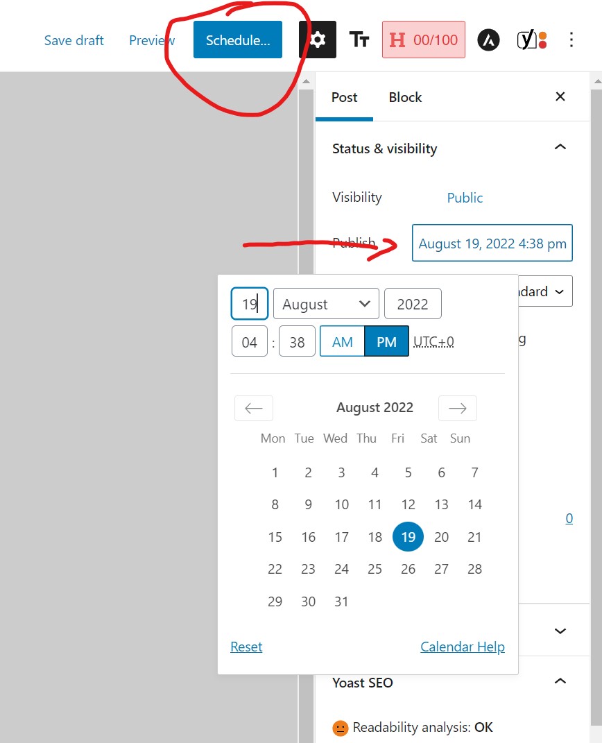 11. Apoi după ce îți va spune că totul e ok va trebui să programezi articolul conform planificarii – apasând pe butonul Immediately care îți va permite să setezi data de publicare – dupa ce setezi data poți să apeși pe Schedule. Îți va apărea linkul articolului tău pe care va trebui să îl copiezi și să îl pui în textul postării. Linkul în poți găsi mereu mai jos în dreapta la Permalink.